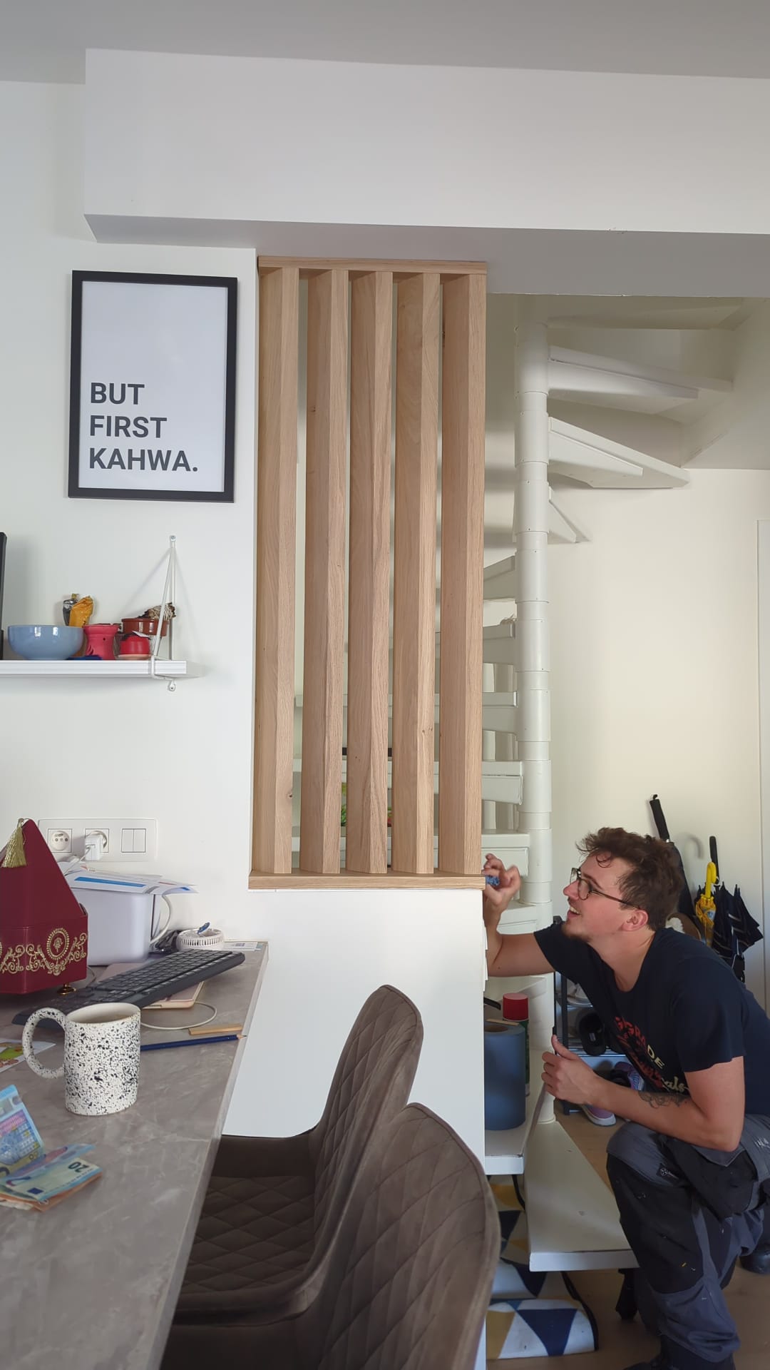 Une solution pratique et élégante de séparer 2 espaces tout en conservant un endroit pour ranger des chaussures.